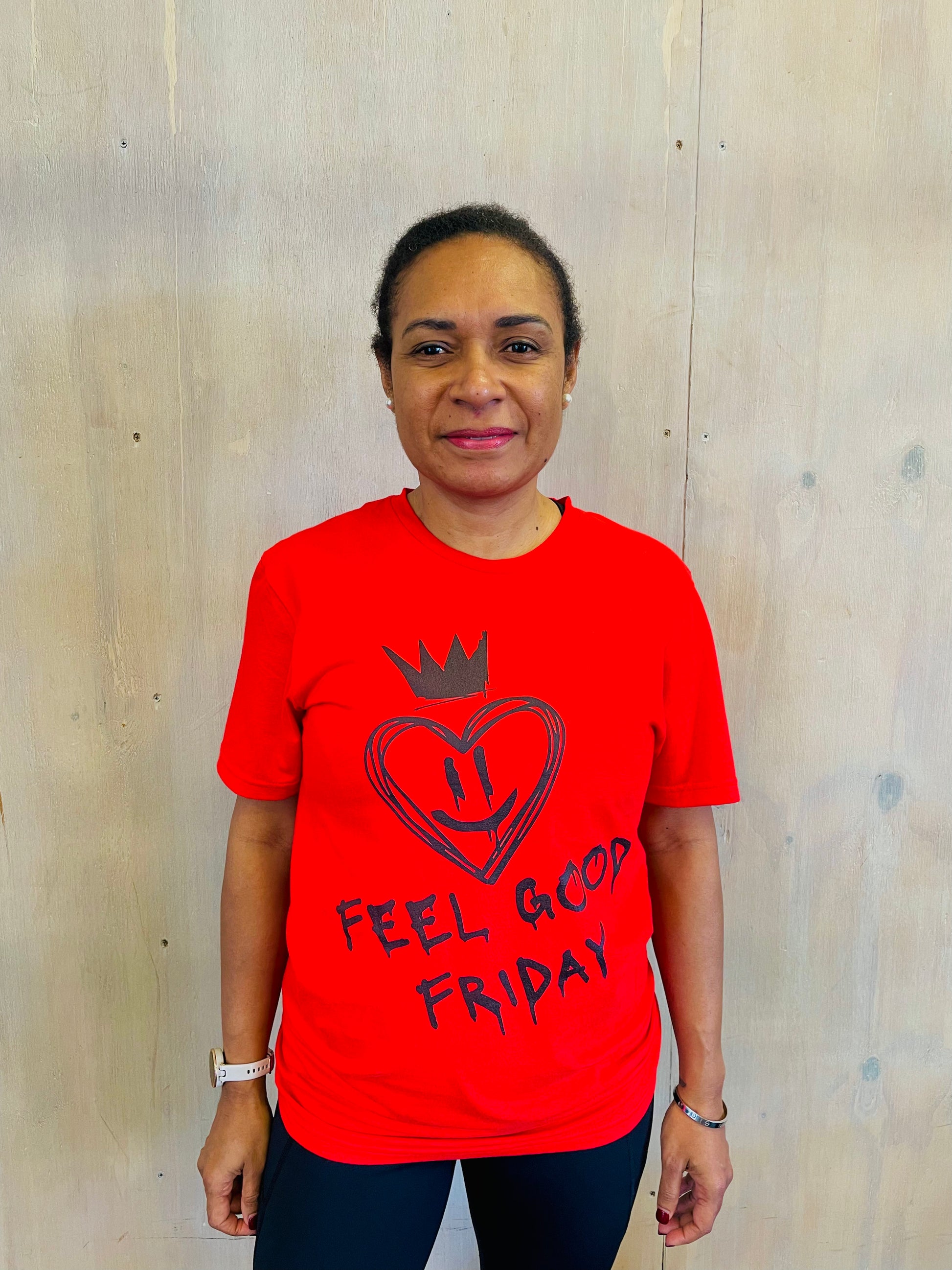 Introducing the Feel Good Friday Tee Red—a dynamic display of good vibes. This version is supercharged in bold red, embodying unflinching strength and unapologetic confidence.